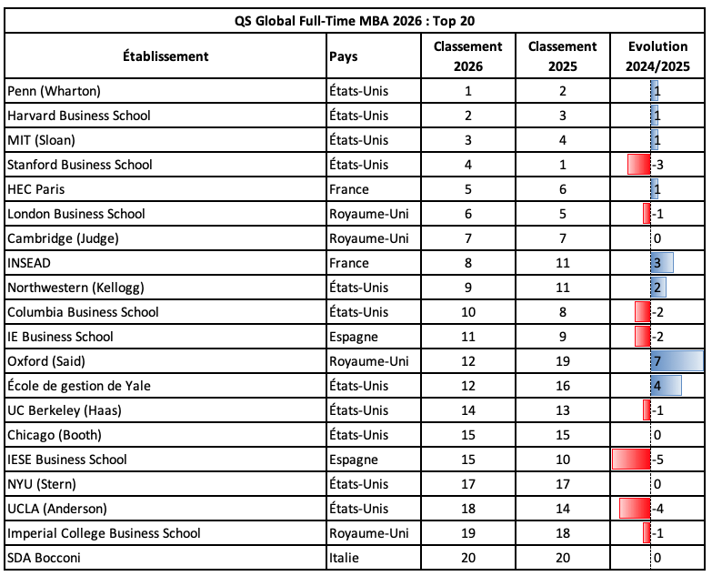 Les États-Unis continuent de dominer le haut du classement QS Global MBA and Business Master’s Rankings 2025. La Wharton School a été sacrée meilleure école au monde pour la première fois depuis 2020 et se classe en tête du classement mondial pour l’employabilité. Le MBA de Stanford GSB, qui occupait la première place l’année dernière, recule à la quatrième en raison d’une baisse de certains indicateurs, notamment l’employabilitéet la diversité. La Harvard Business School occupe la deuxième place et le MIT (Sloan) gagne une place et se hisse à la troisième place. Tout de suite derrière ce quatuor américain HEC Paris prend la 5ème place à la London business school alors que l’Insead remonte de la 11ème à la 8ème. Le meilleur établissementasiatiqueproposant des MBA est la National University of Singapore Business School, qui se classe 23ème au niveau mondial