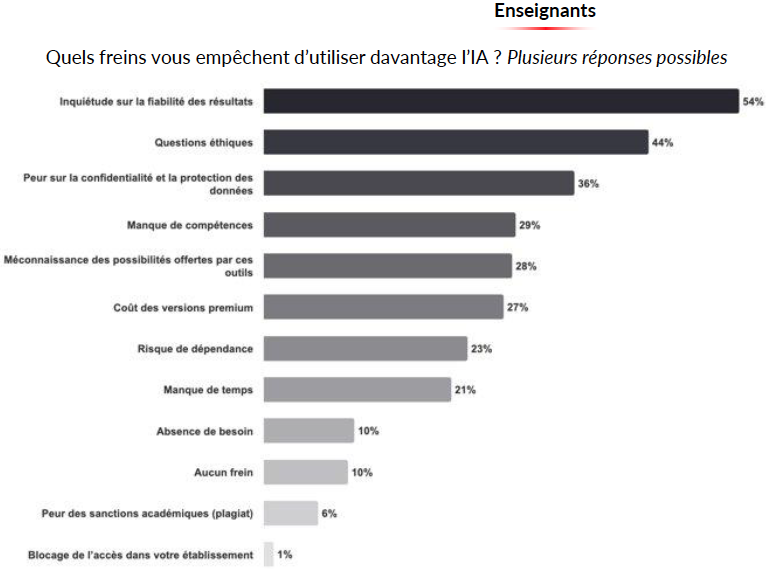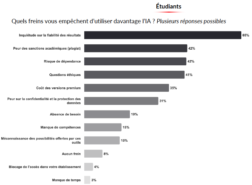 La fiabilité des résultats constitue le principal frein, citée par 54 % des enseignants et 65 % des étudiants. Les préoccupations éthiques, la confidentialité des données ou encore le manque de compétences freinent également l’adoption des IA.