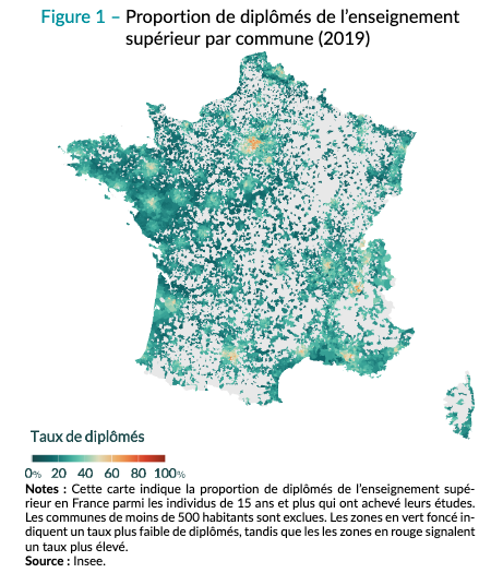 BTS / CPGE : une offre de formation géographiquement déséquilibrée. La proportion de diplômés du supérieur varie considérablement selon les régions illustrant plusieurs traits structurels de la géographie française : centralisation autour de Paris, contrastes entre zones urbaines et rurales, et forte disparité de l’offre de formations. La distance à la formation la plus proche peut représenter un obstacle important à la poursuite d’études, notamment au moment charnière de la fin du lycée. Les élèves éloignés des centres universitaires s’inscrivent moins souvent dans l’enseignement supérieur et y obtiennent de moins bons résultats.