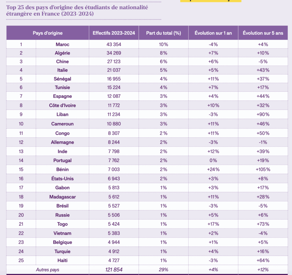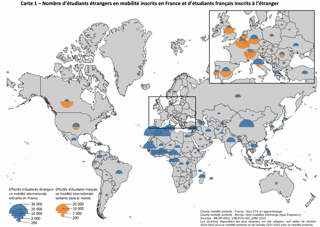 Étudiants internationaux, jusqu’où ? La hausse du nombre d’étudiants internationaux est-elle un relais de croissance pour l’enseignement supérieur ? A la rentrée 2024, 329 100 étudiants étrangers en mobilité internationale sont en tout cas inscrits dans l’enseignement supérieur en France, soit 12 % de l’ensemble des effectifs. Ce nombre poursuit sa progression régulière (+3 % en un an, +13 % par rapport à 2019-2020 et +38 % en 10 ans) », constate le Système d’information et études statistiques (SIES) dans sa note Les effectifs d’étudiants étrangers en mobilité internationale en 2024-2025. Cette croissance est portée depuis plusieurs années par des flux importants d’étudiants en provenance d’Afrique et d’Asie ainsi que par l’attractivité internationale des écoles de commerce, gestion et vente. « Les mobilités étudiantes vers la France ont trouvé leur vitesse de croisière, dans un contexte international incertain », analyse Donatienne Hissard, directrice générale de Campus France : « Les étudiants mobiles n’ont jamais été aussi nombreux dans le monde, mais leurs choix de destination se diversifient : on est passé d’une poignée de compétiteurs à une palette plus large, avec un repli en cours aux Etats-Unis, premier pays d’accueil. Le défi pour l’Europe et la France est de se positionner comme une alternative dans ce paysage inédit. »