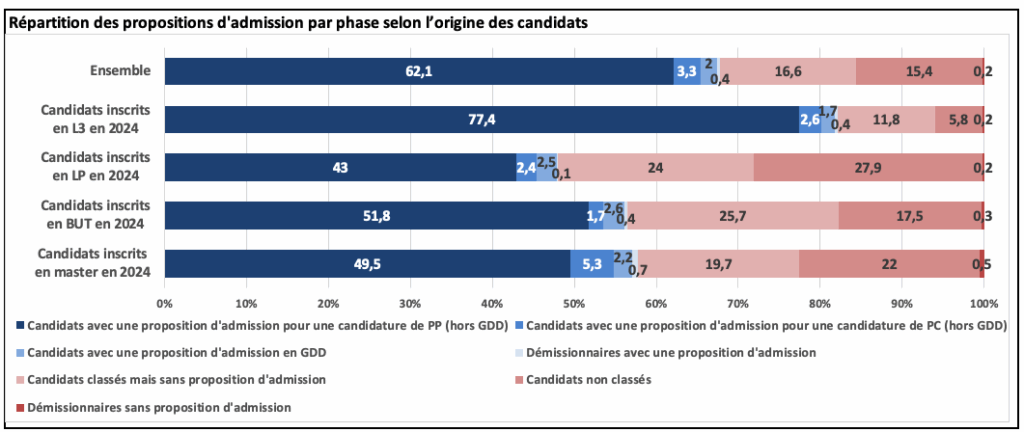 Une phase complémentaire plus restreinte mais utile. Du 17 juin au 17 juillet, 39 300 candidats participent à la phase complémentaire, dont près de 8 000 nouveaux candidats. Durant cette période, 6 points supplémentaires de candidats reçoivent une proposition, et la proportion d’acceptations progresse également (+8 points). Si cette phase ne représente qu’une minorité des admissions, elle joue un rôle d’ajustement essentiel.