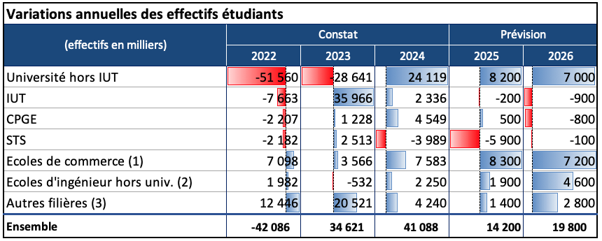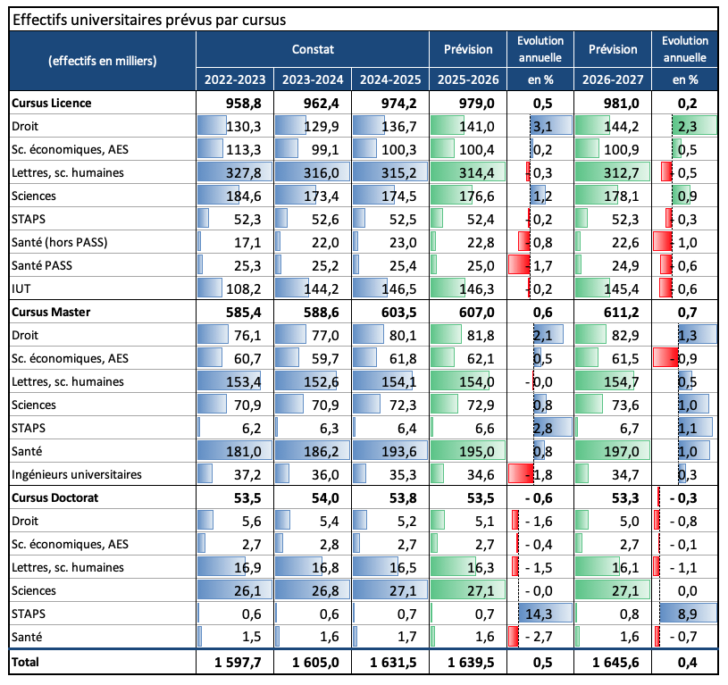 Les effectifs universitaires en master (M) continueraient quant à eux de croître en 2025 (+3 500, soit +0,6 %) et en 2026 (+4 200, soit +0,7 %).