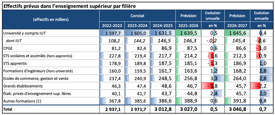 La croissance de l’effectif devrait se poursuivre à un rythme similaire à la rentrée 2026 pour atteindre 3 046 800 étudiants (+19 800). Le nombre d’étudiants augmenterait en université, malgré une faible baisse en IUT. Selon le SIES la hausse des effectifs « resterait dynamique en école de commerce, dans les écoles d’ingénieurs (hors université) et dans les établissements privés ». Il n’y a qu’en sections de technicien supérieur (STS) que l’effectif diminuerait pour la seconde année consécutive, y compris dans les cursus en apprentissage.