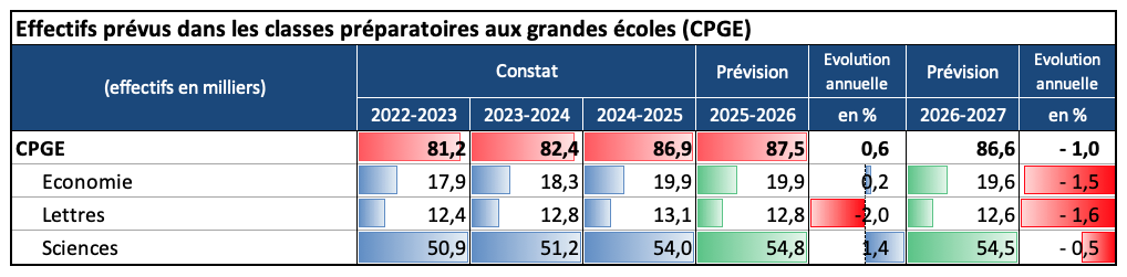 En dehors de l’université, les tendances sont variables selon les filières. En CPGE, l’effectif serait en légère croissance en 2025 (+500 étudiants, soit +0,6 %), avant de fléchir l’année suivante (-1%).