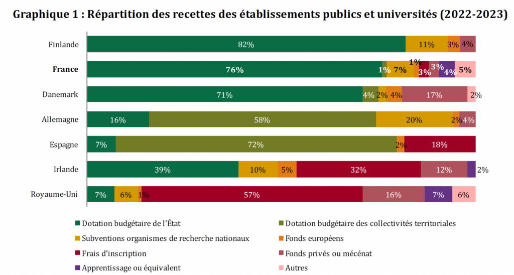 Comparée à d’autres pays européens, la France appartient au groupe des systèmes fortement financés par l’État, avec des droits d’inscription faibles et une faible sélectivité à l’entrée à l’université. À la différence des modèles anglo-saxons, les ressources propres y jouent un rôle secondaire.