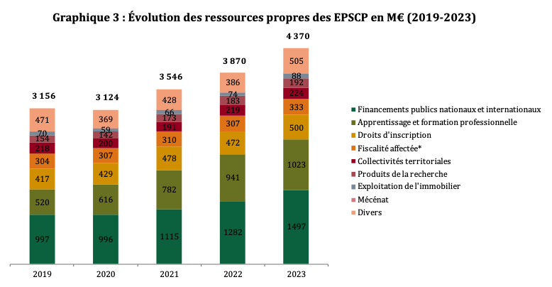 La dynamique récente des ressources propres tient d’abord à l’apprentissage. Les recettes associées pour l’enseignement supérieur public atteignent 688 millions d’euros en 2023 (auxquels s’ajoutent 65 millions issus du solde de la taxe d’apprentissage). Depuis 2018, le nombre d’apprentis dans l’enseignement supérieur a fortement augmenté, porté par la réforme de 2018 et par des niveaux de prise en charge favorables.